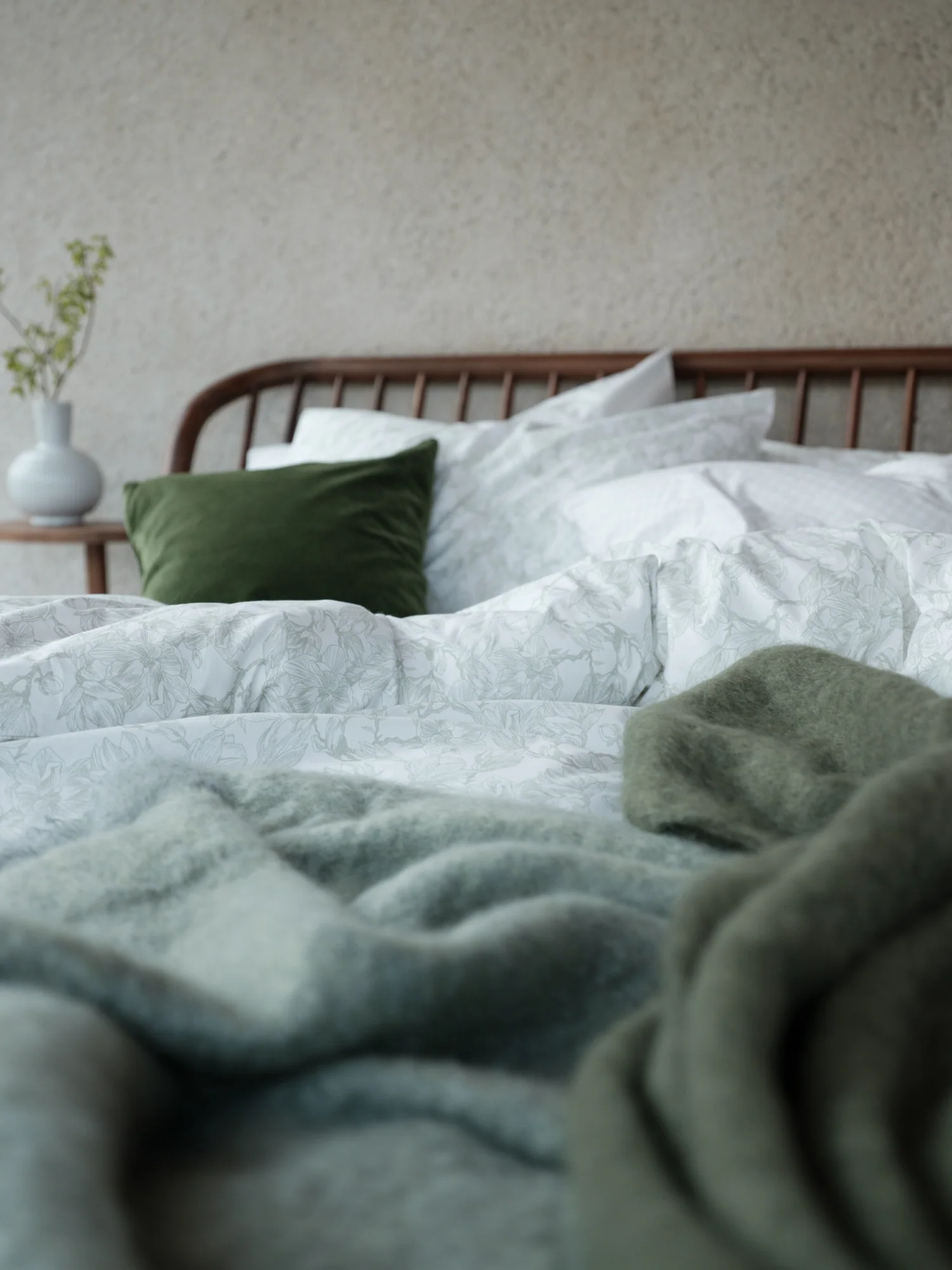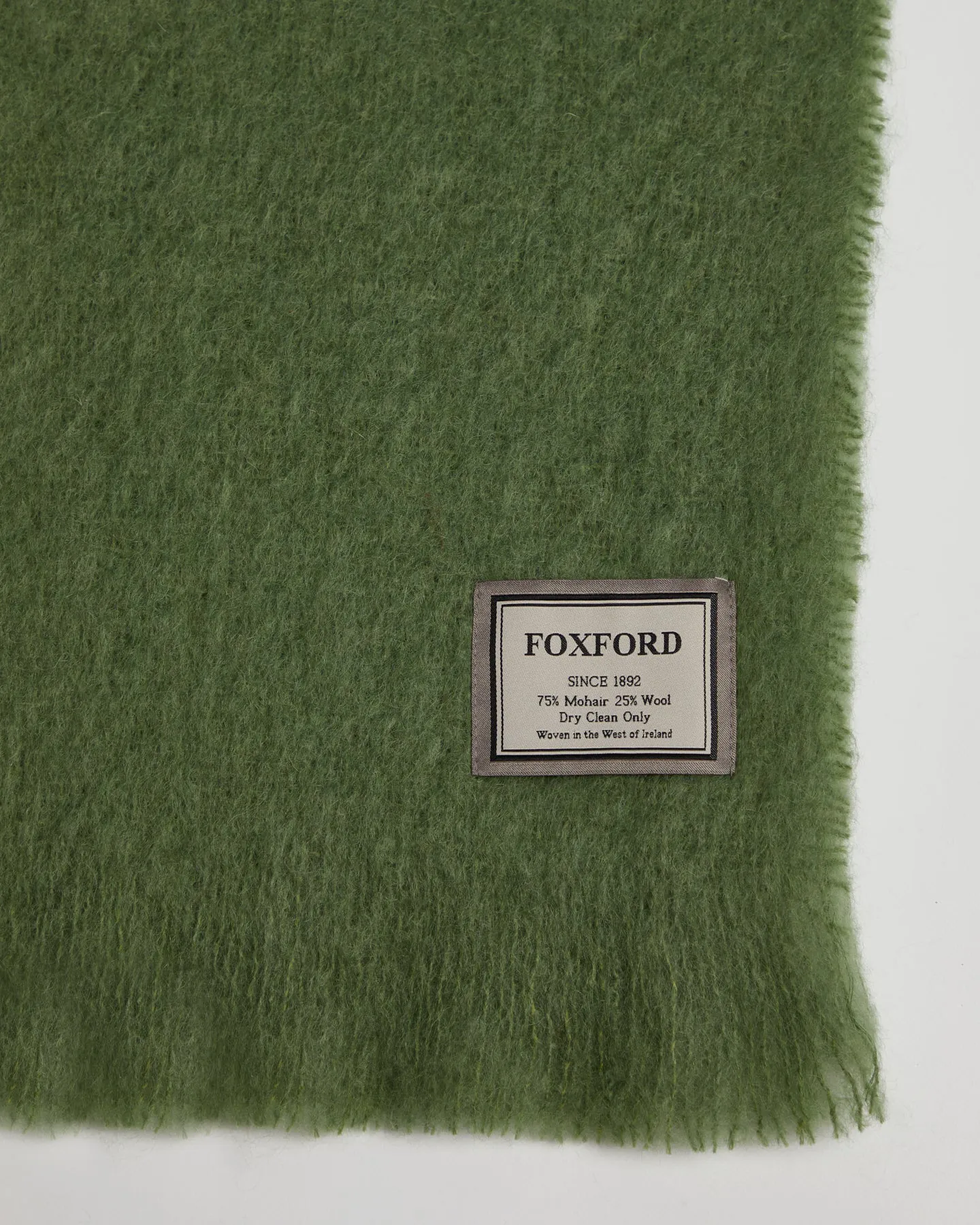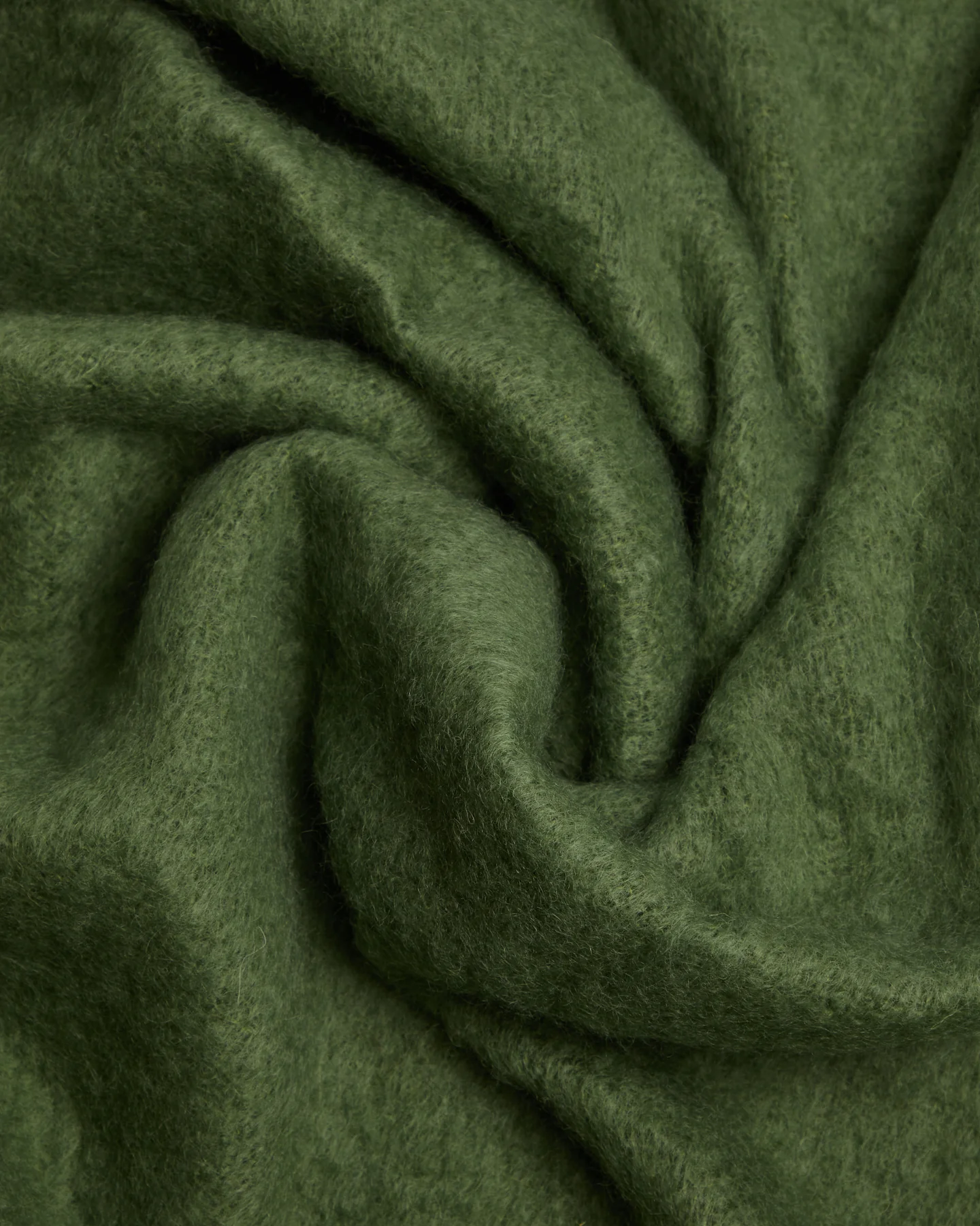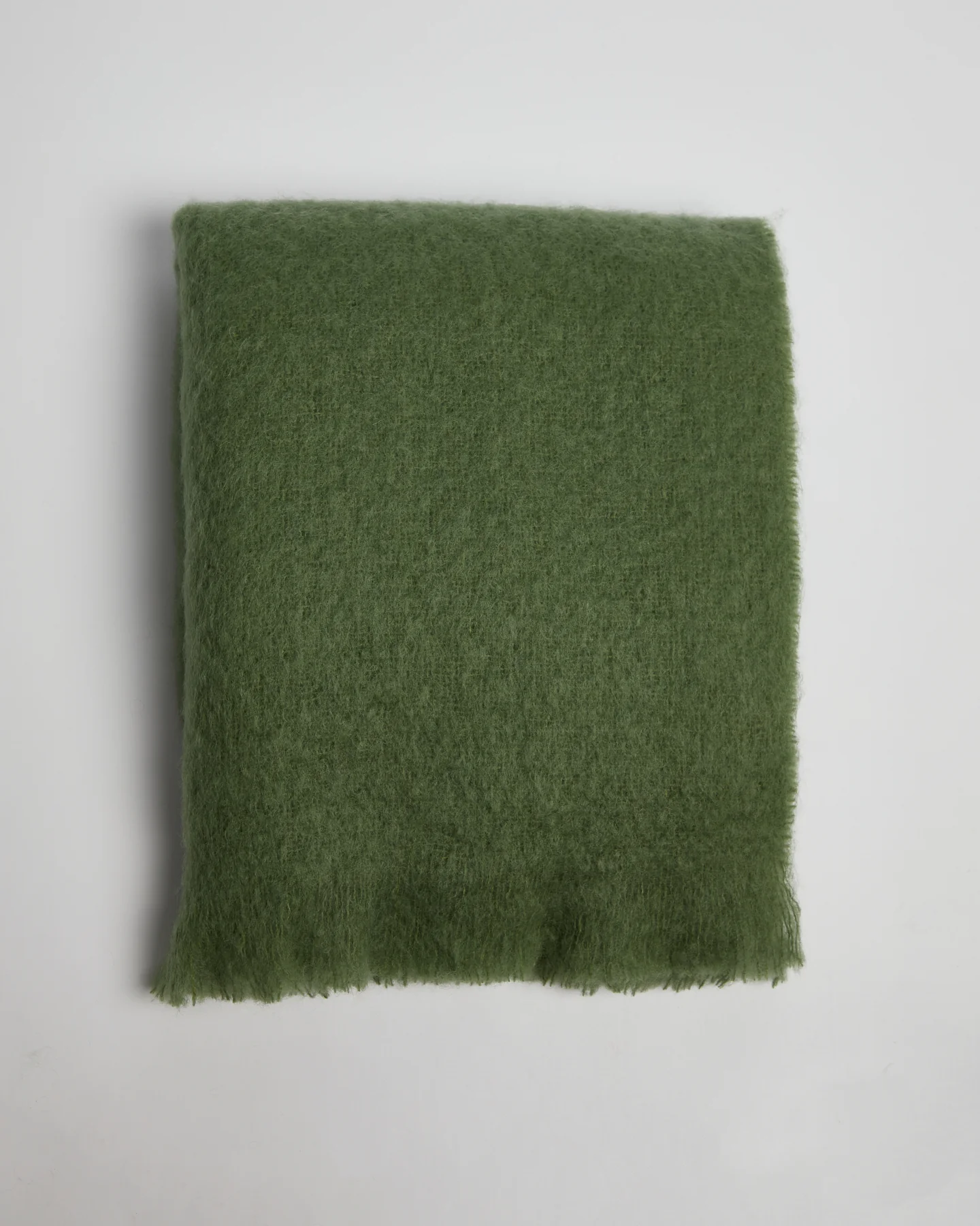 Leichte Mohairdecke in Moosgrün mit weicher, flauschiger Struktur. Warm, natürlich und hochwertig in Irland gewebt – für ruhige Wohnakzente und stilvolles Wohnen im Nordseegefuehl.