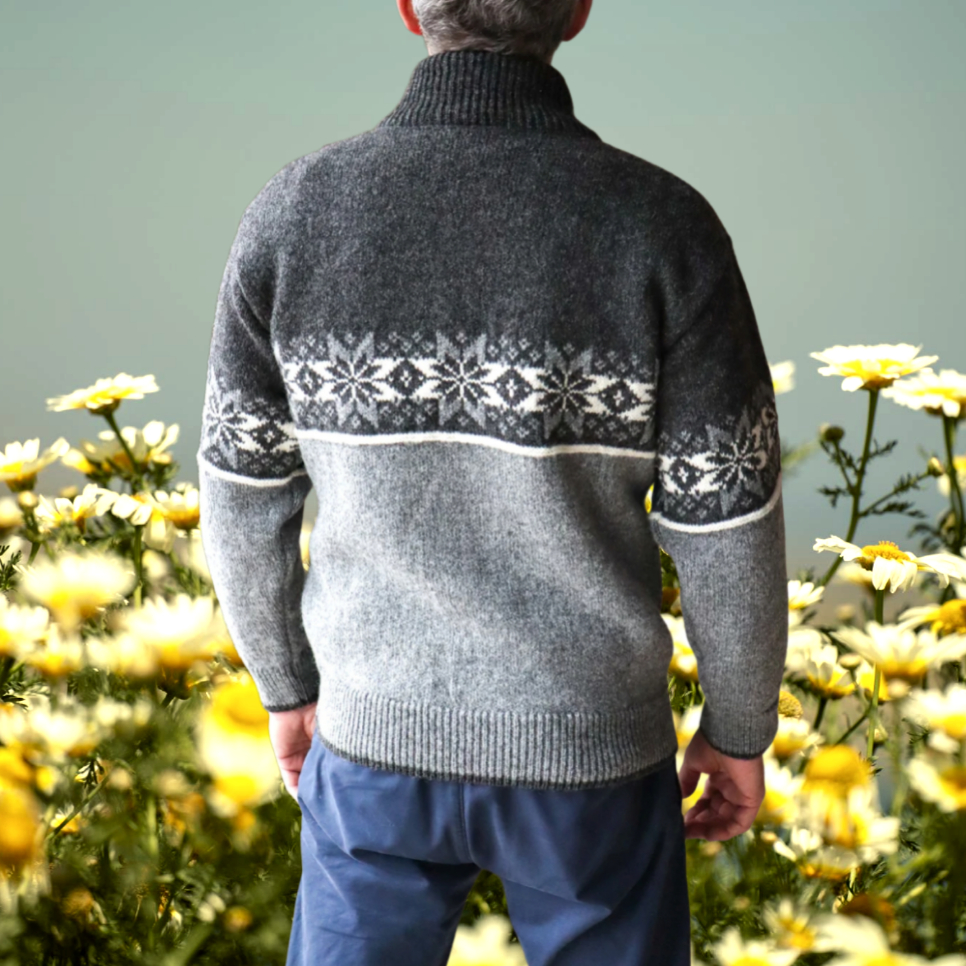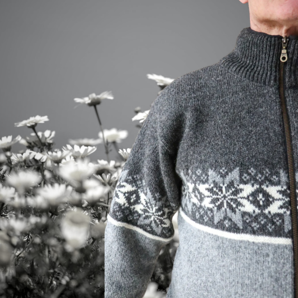 Norwegische Strickjacke aus 100 % reiner neuer Wolle. Mit Reißverschluss, hohem Kragen und klassischem Norweger-Muster – warm, zeitlos und unisex tragbar.